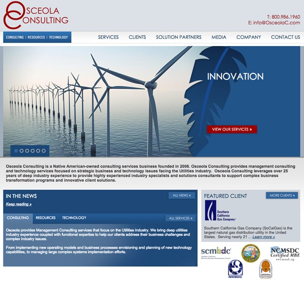 WebSight Design recently completed the design and development of Osceola's website with the company's three key values in mind: Integrity, Execution, and Innovation. Leveraging over 25 years of deep industry experience, Osceola Consulting employs highly experienced industry specialists and solutions consultants to support complex business transformation programs and innovative client solutions. The navigational structure of Osceola's new website makes it easy for potential and existing clients to find the information they're looking for. To keep a consistent brand identity, WSD selected a grey and blue color pallet that was used throughout the site. Osceola Consulting's logo, contact information, and call to action button all stand out in red.